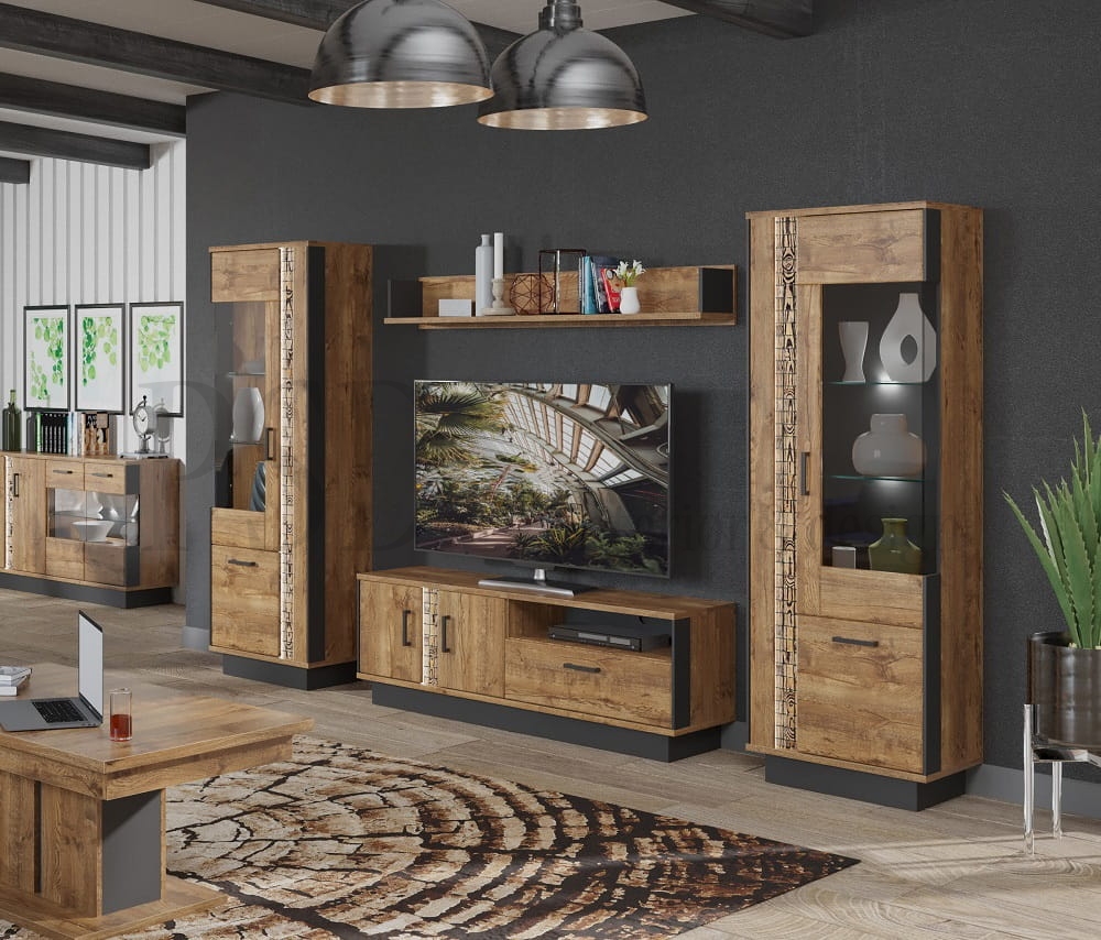 Består av: tv-benk DN1, vitrine høy DN6 og DN7, hylle DN10