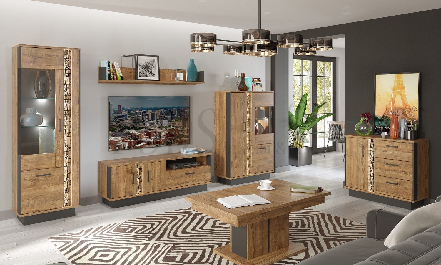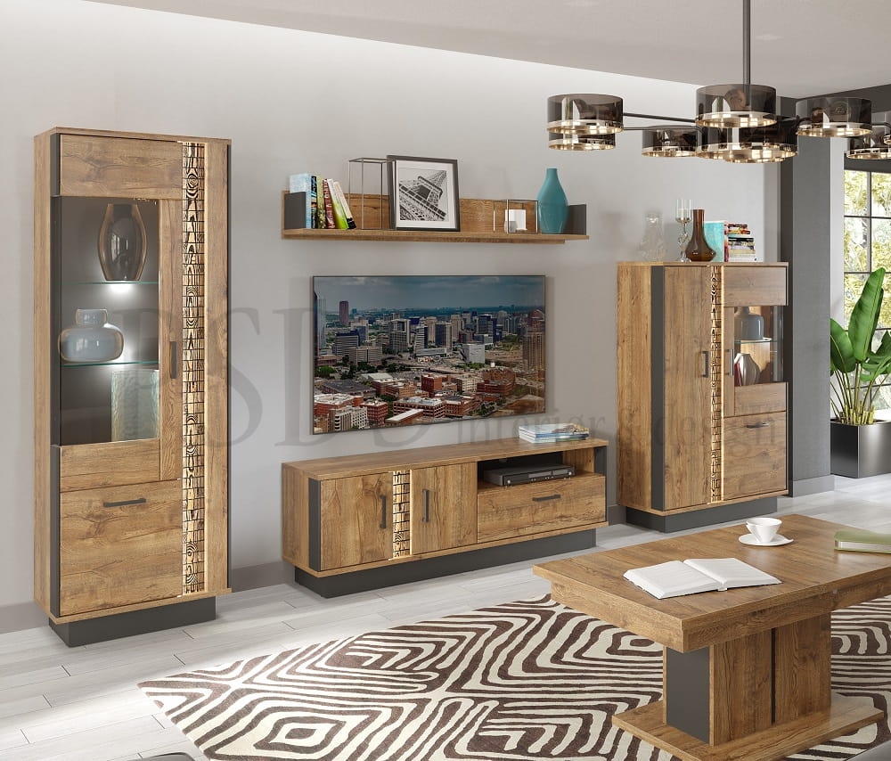 Består av: tv-benk DN1, vitrine høy DN6/7, vitrine lav DN5 og hylle DN10