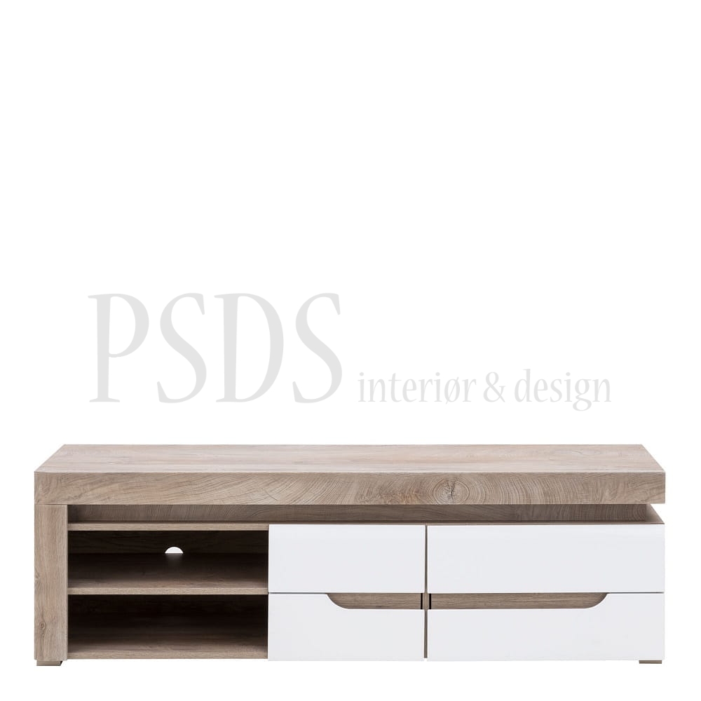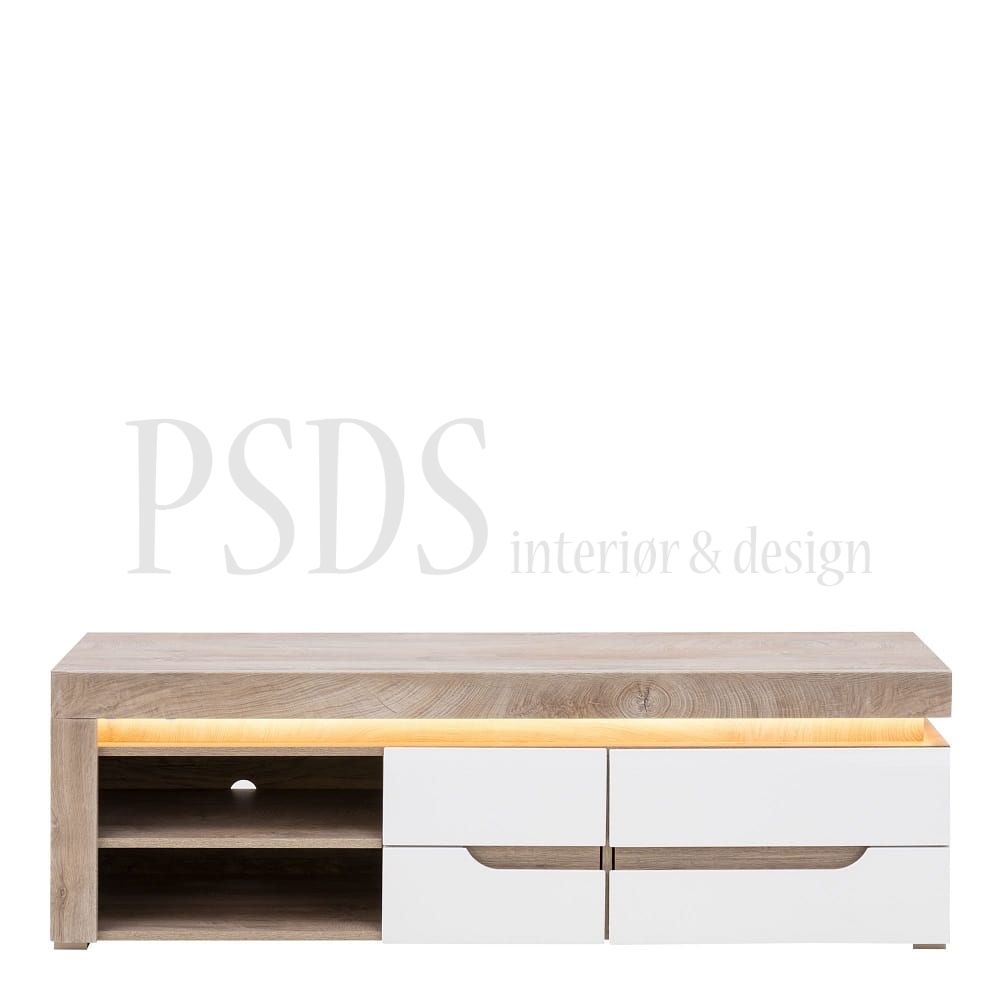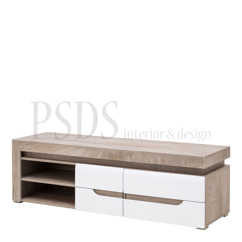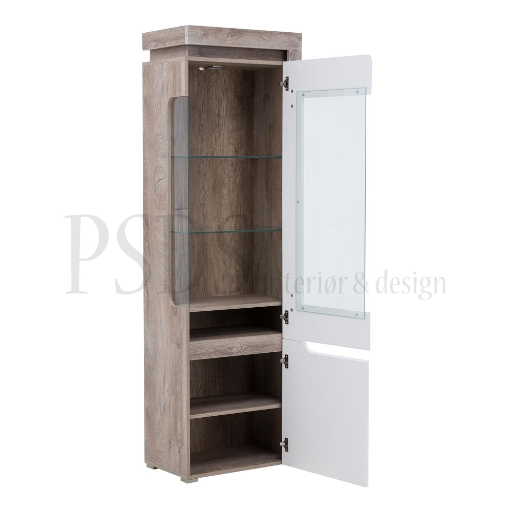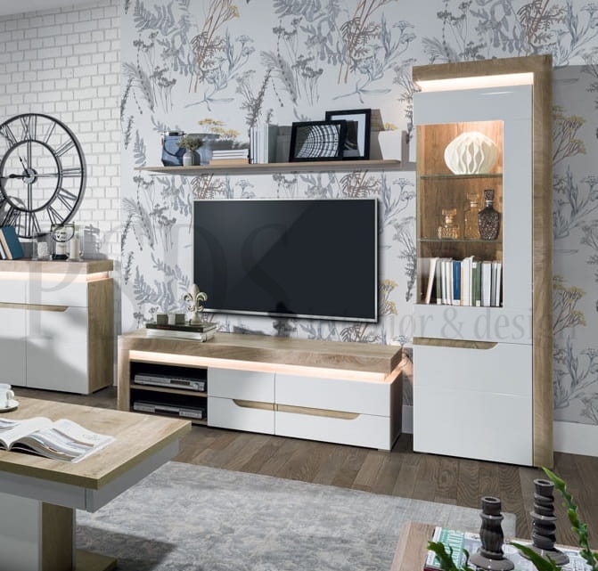 Består av: høy vitrine, tv-benk og hylle