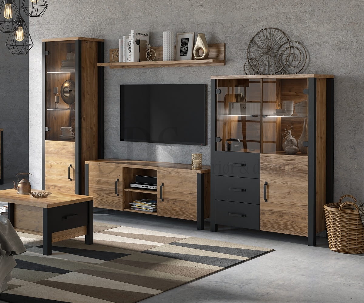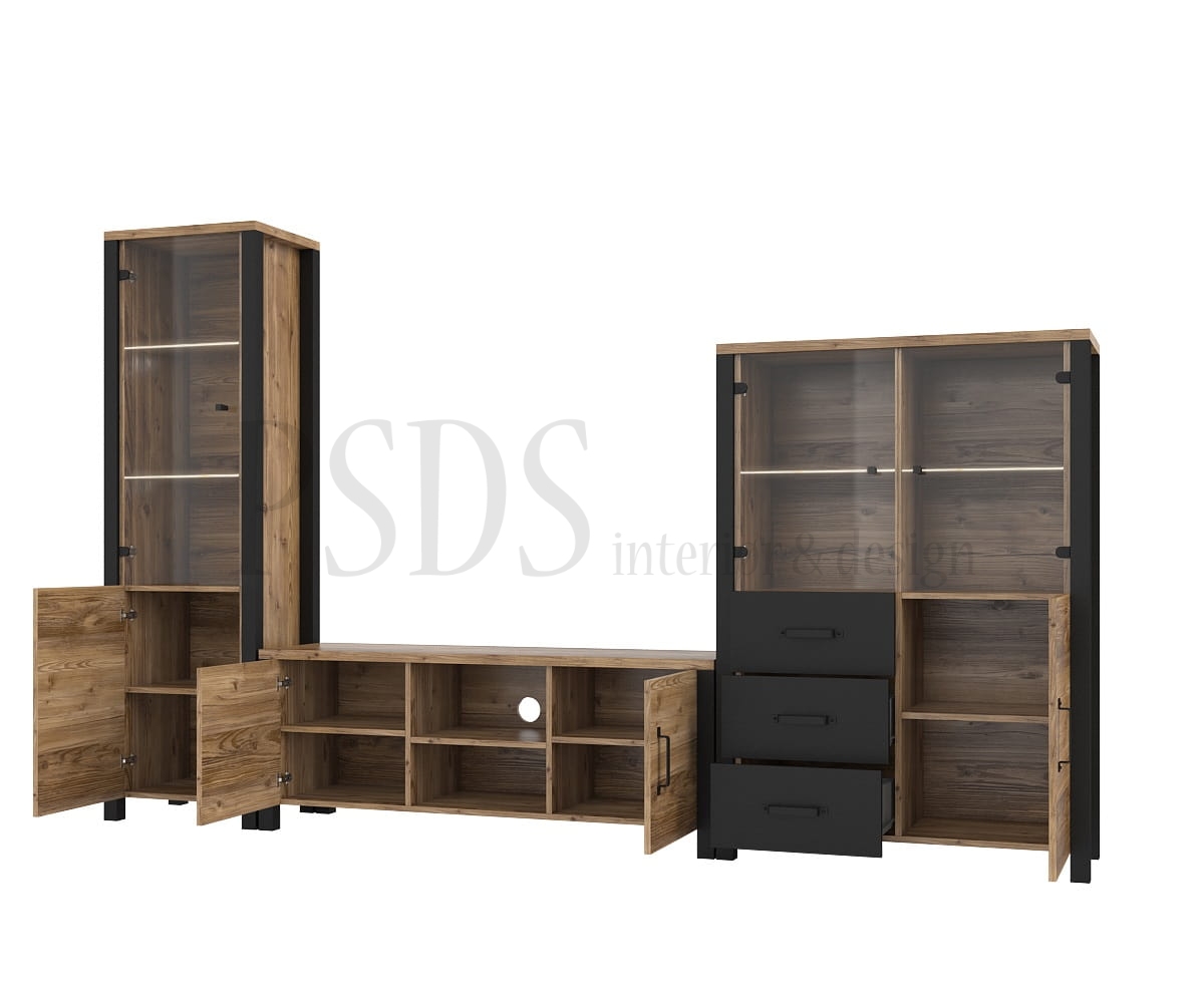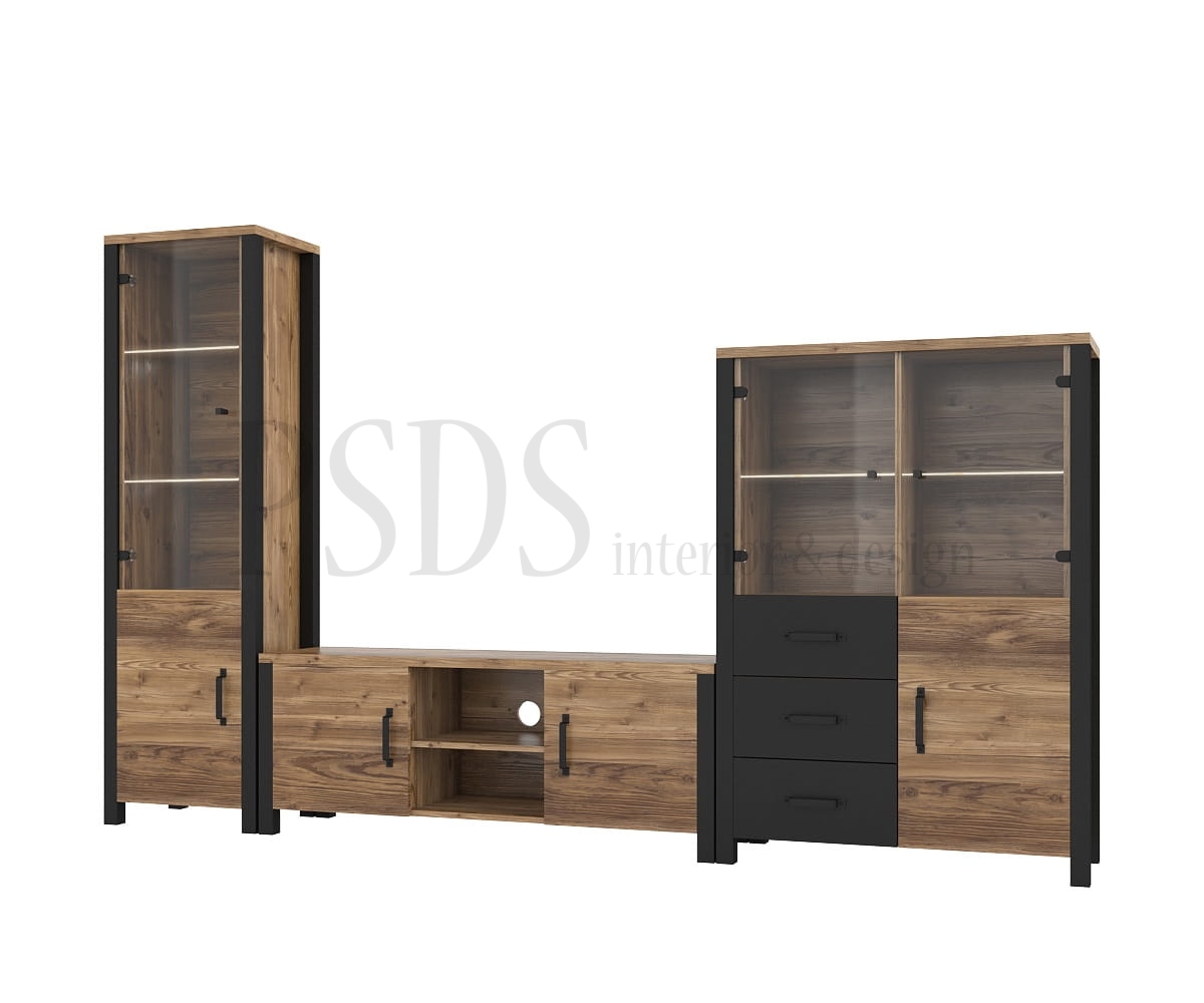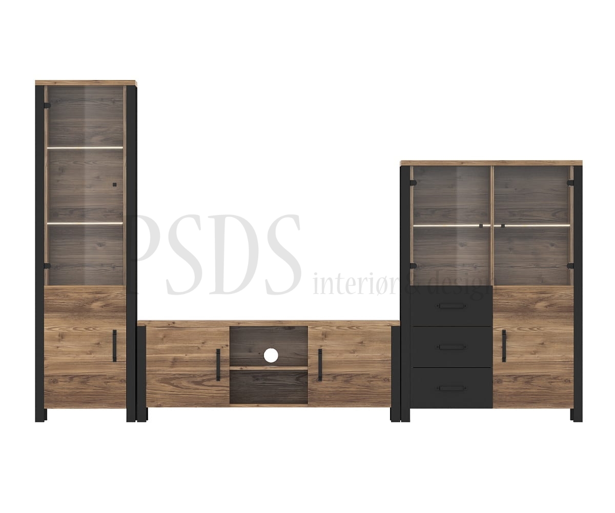 Består av: tv-benk 41, høy vitrine 05, lav vitrine 44 og hylle 02